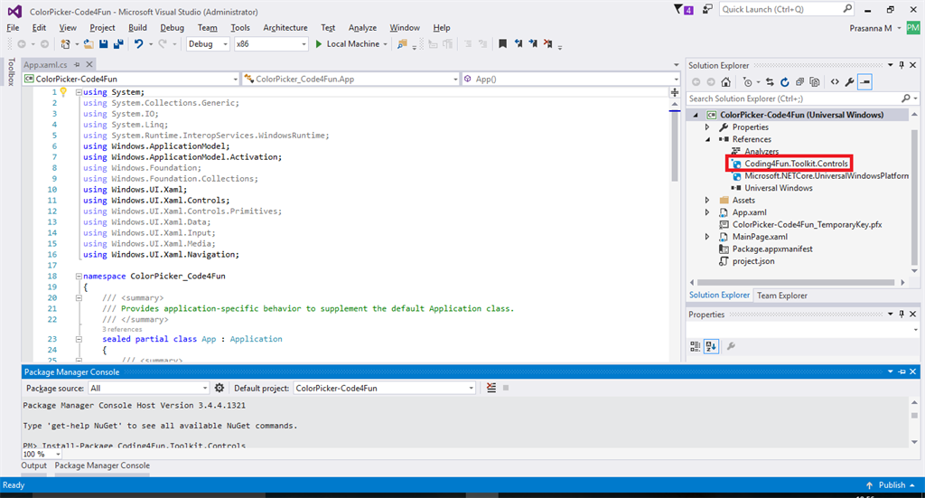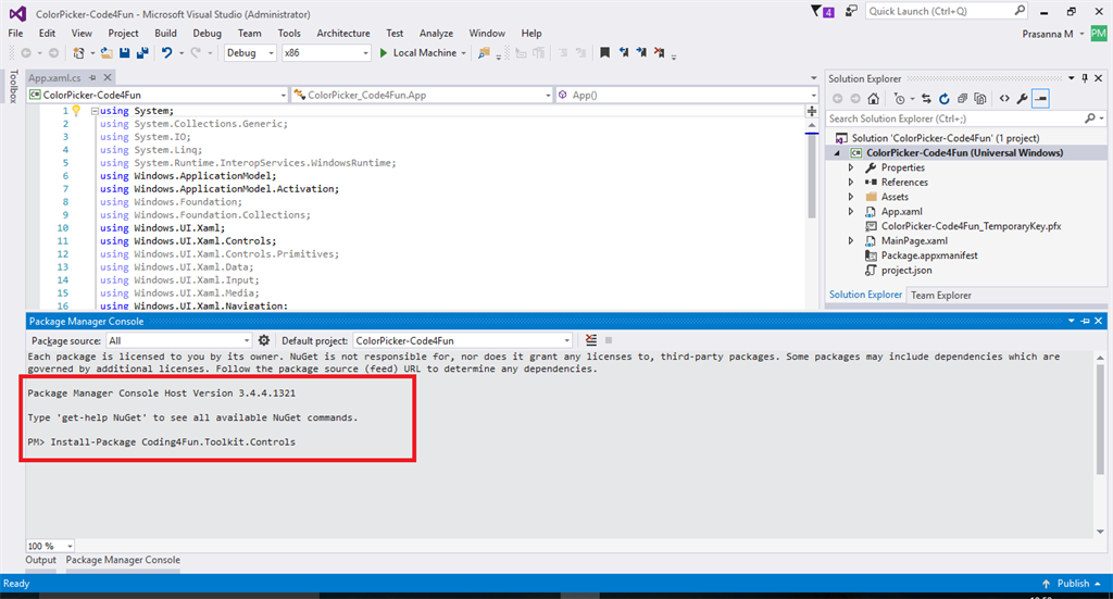 Now it's time to download and install Code4Fun Toolkit from the internet. Click Tools followed by Manage Nuget Packet Manager and then Package Manager Console. Then use the following command to download Code4Fun toolkit.