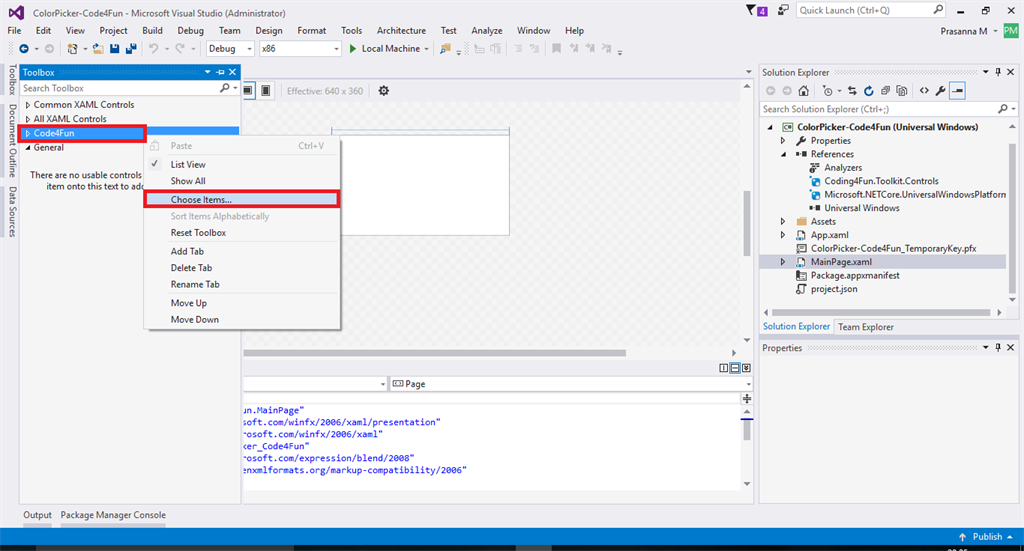 Right click on “Code4Fun” and click choose items and add the Code4Fun toolkit library file. So locate the Coding4Fun.Toolkit.Controls.dll that is available in a .nuget folder in the user's folder.