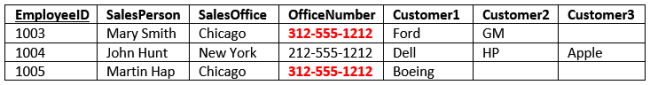 Notice that for each SalesPerson we have listed both the SalesOffice and OfficeNumber. This information is duplicated for each SalesPerson. Duplicated information presents two problems: