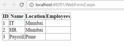 Now, look at the output. We got Id, Name and location but we didn’t get the Employee details. It is basically because we need to add one more thing here. Select the properties of Entity DataSource.