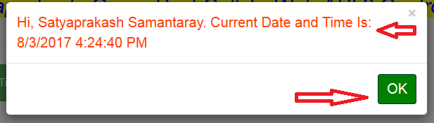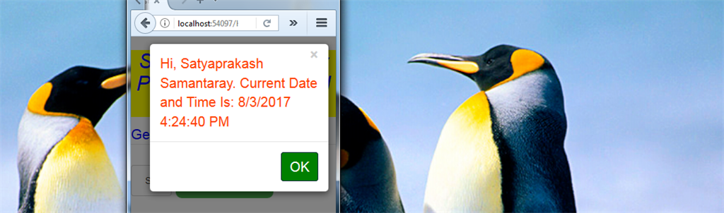 Here, I will show you how jQuery POST Calls to Web API 2 Controller method using jQuery AJAX in ASP.NET MVC Razor. I designed a web page using MVC and put a text box and a button.The text box will be asking your name. By putting your name, when you click on the button, an alert message will show you the current date & time with your name.