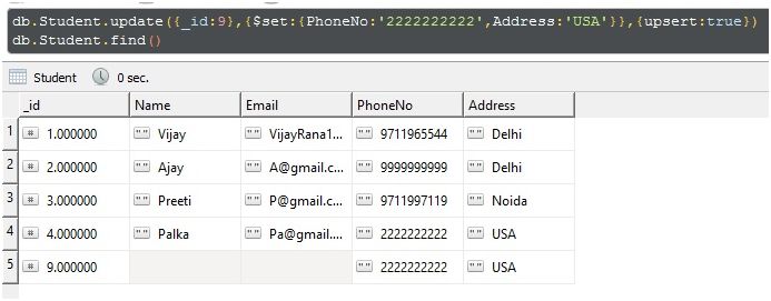 db.Student.update({_id:9},{$set:{PhoneNo:'2222222222',Address:'USA'}},{upsert:true}) above query will search a document where _id is 9. it there will be a _id with 9 it will update phoneNo and Address otherwise it will insert a new document where _id is 9.