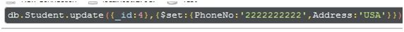 It will update only one record(remember only first Match where name is "Vijay"). But if we want to update all the records where Name is "Vijay" then we will pass multi argument also db.Student.update({Name:"Vijay"},{$set:{PhoneNo:'2222222222',Address:'USA'}},{multi:true}) |
