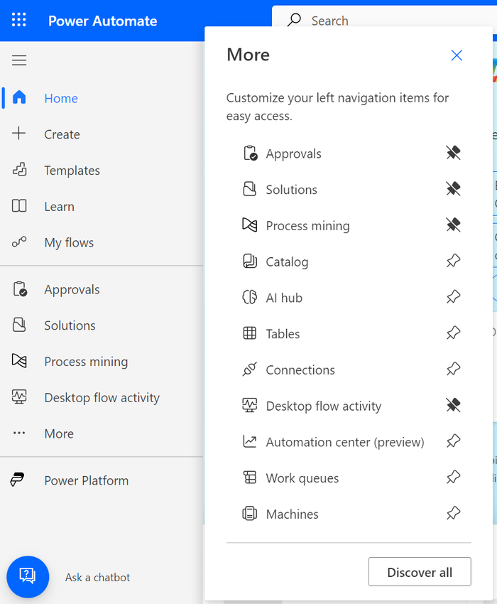 The Learn section offers resources and documentation to help you understand and make the most of Power Automate. It includes tutorials, guides, and best practices.