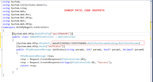 In order to generate and bind marked parameters as specified in our WebAPI controller action method, we are going to add MultiPostParams attribute on it.