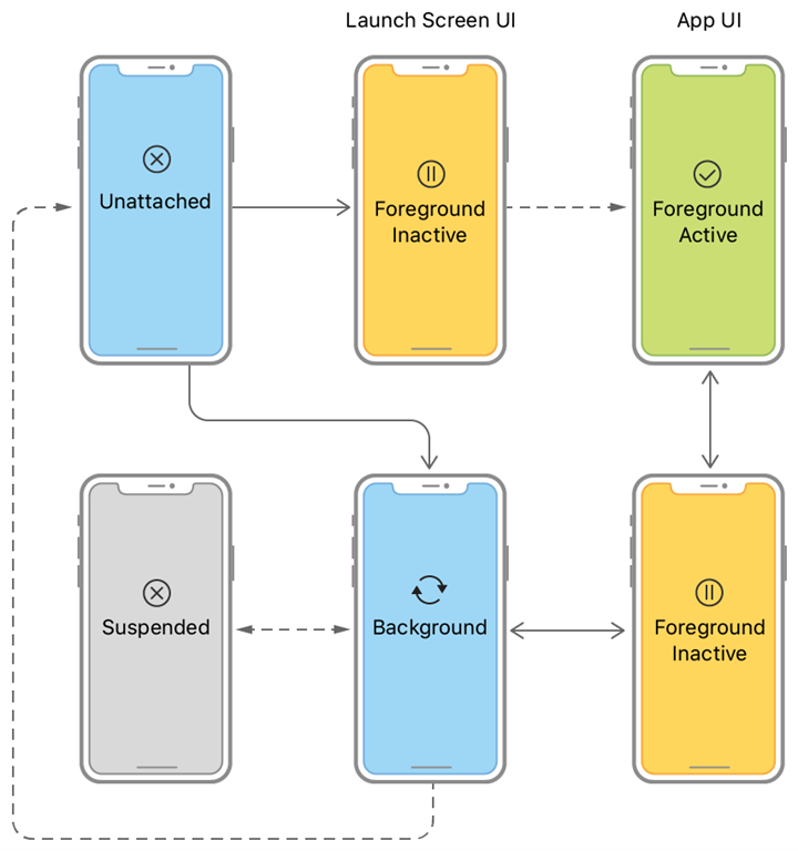 The following figure shows the state transitions for scenes. When the user or system requests a new scene for your app, UIKit creates it and puts it in the unattached state. User-requested scenes move quickly to the foreground, where they appear onscreen. A system-requested scene typically moves to the background so that it can process an event.