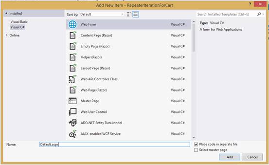 Create a new ASP.NET web-based project named RepeaterIterationForCart.