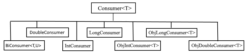 ObjIntConsumer<T>, ObjLongConsumer<T>, ObjDoubleConsumer<T> functional interfaces, these all functional interfaces are the same and only differ in their return type value of the method. This represents an operation which accepts an object valued and an int/long/double - valued argument and returns no result.