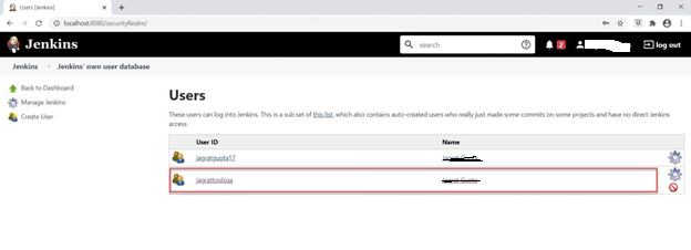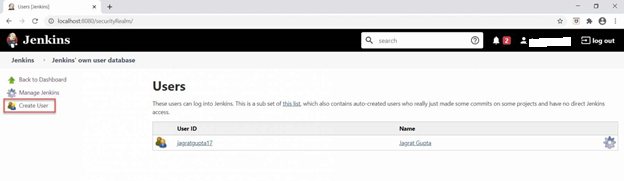 Step 3 - As soon as we click on "Manage Users" under the Security section on the Manage Jenkins page, we will be redirected to the Users page.