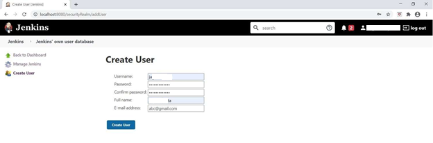 Step 4 - As soon as we will click on the Create User link, we will be redirected to the Create User page on which we need to fill in the username, password, confirm password, Full name, and email address information.