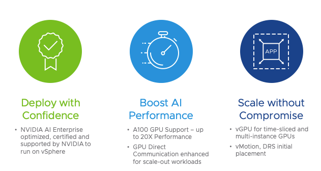 - Certified and Supported: Certification by NVIDIA means that the solution has undergone extensive testing to ensure compatibility and performance. This assures organizations that their AI deployments are supported by both NVIDIA and VMware, reducing the risk of compatibility issues and enhancing overall stability.