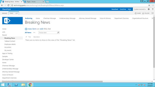 Now, we are going to insert some news into Breaking News list from Authoring site collection.