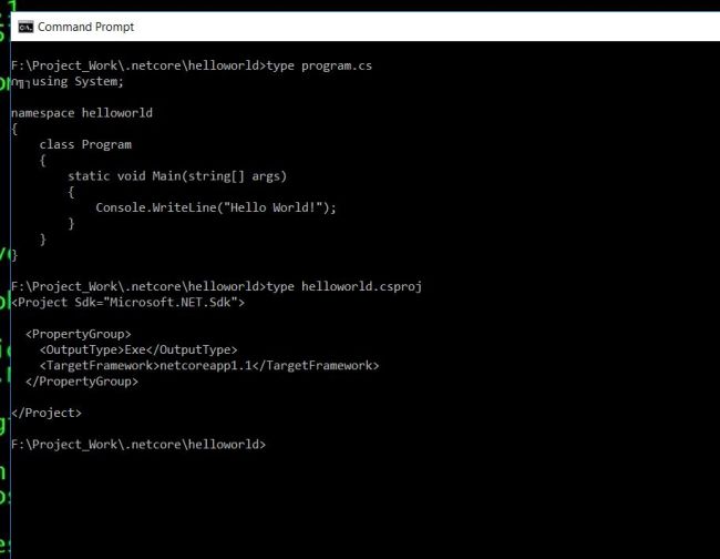 As per the above image, a console application has been created with two files – helloworld.csproj and program.cs. Now, we want to know what is written in program.cs file. For that, type the following command.