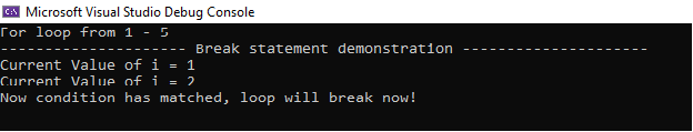 - Console.WriteLine("Now condition has matched, loop will break now!");