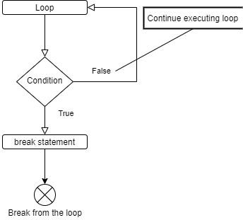 - In loop, after occurance of a break statement, execution of the loop will be terminated, hence statements below the break won't execute for current index and control will jump out of the loop.