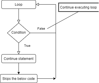 - After the occurance of continue keyword, it skips the following statements and continues with the execution of the next iteration of the loop. It transfers the control to the next iteration of the loop.