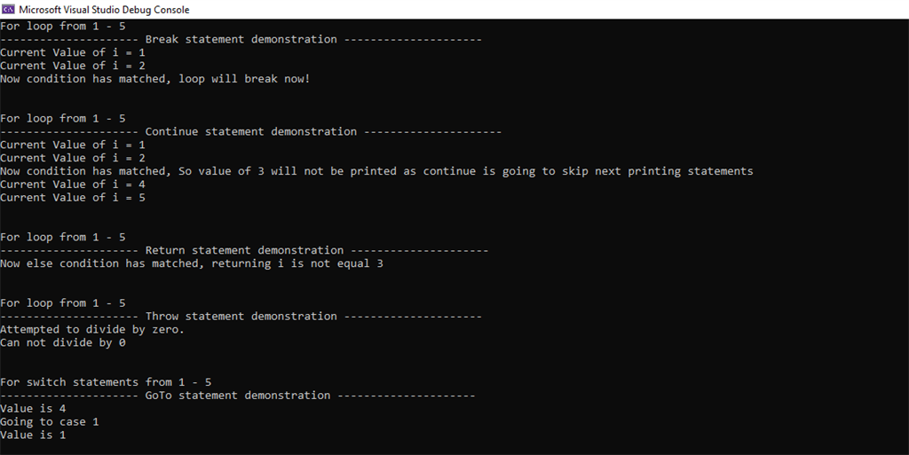Now we know, what types of jump statements there are in C#, which can help us based on the project's requirements.