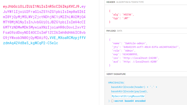 The appsettings.cs file contains the JWT credentials. The credentials are stored here for security reasons. The secret string is used to sign the JWT.
