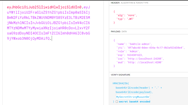 An unsigned JWT that is generated is shown below. Notice that the token has only two encoded parts with a dot at the end of the encoded token. Also, the “alg” claim is none.