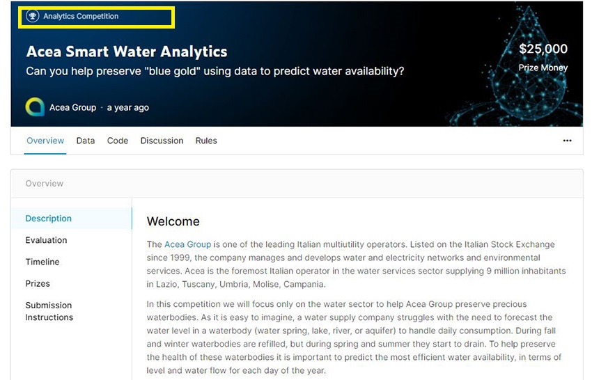 As the name suggests, the Analytics Competition is mainly about Analytics. From feature extraction for Analytics of water amount prediction in competition like Acea Smart Water Analytics, LearnPlatform COVID – 19 Impact on Digital Learning, NFL Big Data Bowl 2021, Data Science for Good: City of Los Angeles – the Analytics competitions are different from other categories of competition and are specifically about Analytics.