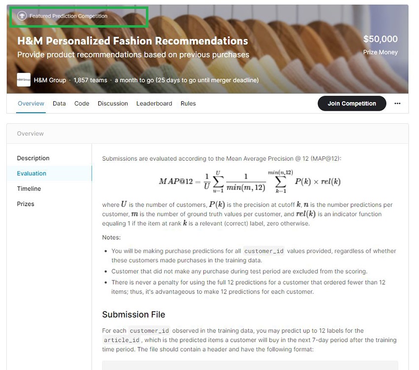 The Featured Kaggle Competitions are the most widely recognized as sought after competitions due to its full-scale range of challenges in machine learning and commercial-purpose driven problems. These competitions are open to everyone and garner participation from some of the greatest minds in the field of machine learning and artificial intelligence. The prizes on these competitions go high as up as $500,000 and thus you’d be competing with the veterans and experts in this field. It’s a great learning experience and a way to brush up your skills for real world use case scenario. As of April 2022, the ongoing Featured Competitions are JPX Tokyo Stock Exchange Prediction, U.S Patent Phrase to Phrase Matching, H&M Personalized Fashion Recommendations and more.