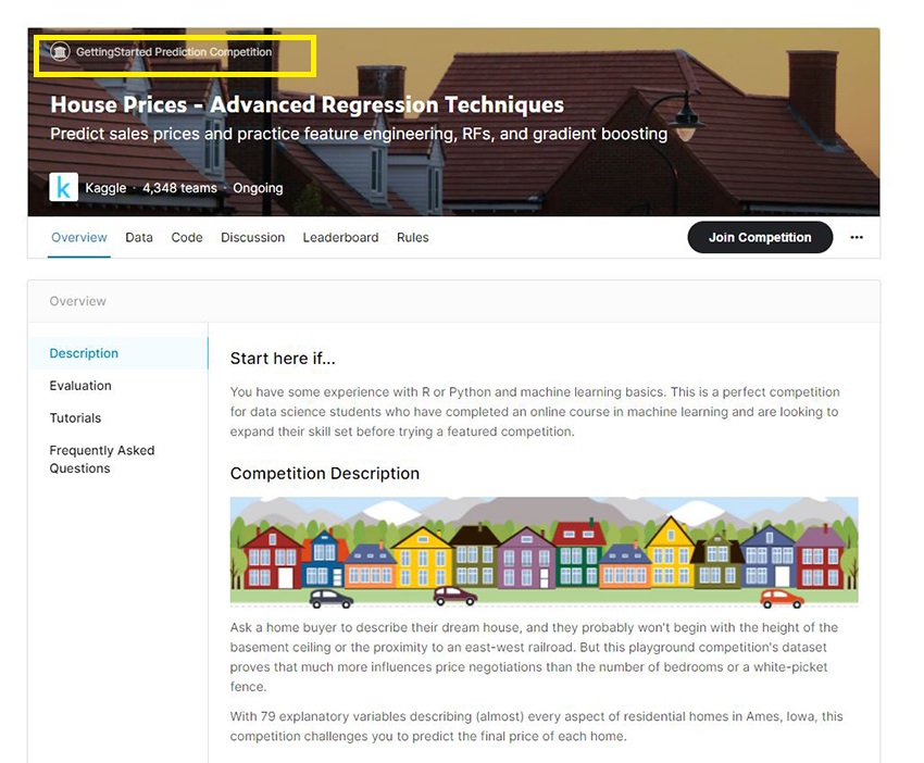 Getting Started are basically the most basic, easiest and approachable competitions available on Kaggle. For anyone who is just getting started in the field of Machine Learning, this is the gateway to participate and learn. These competitions run for the longest duration and thus over time, you’ll find various solutions which makes it the best way to learn the solutions to these problems. However, this type of competitions does not offer any points or prizes in Kaggle. Some of the getting started competitions available are Spaceship Titanic, Natural Language Processing with Disaster Tweets, House Prices – Advanced Regression Techniques. All of these problems use different types of algorithms which can be a great way to learn the Machine Learning approaches.