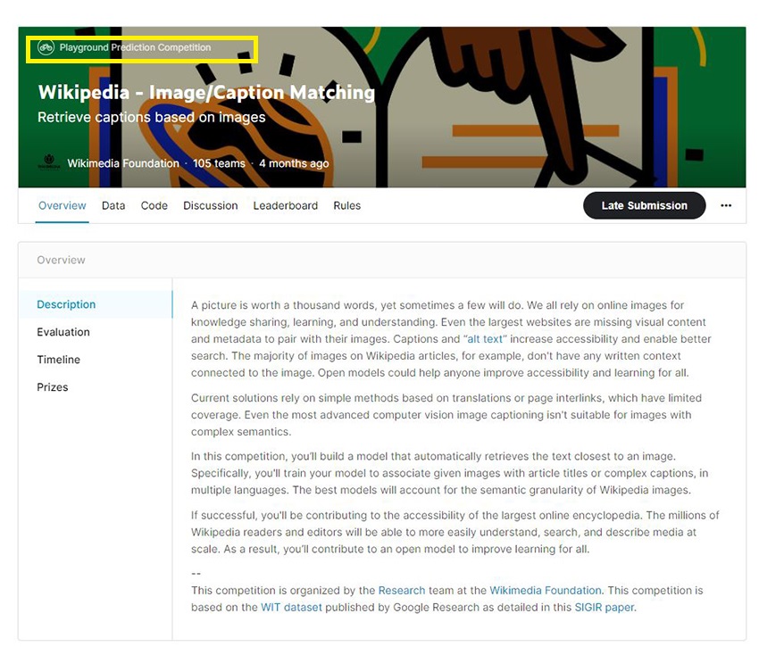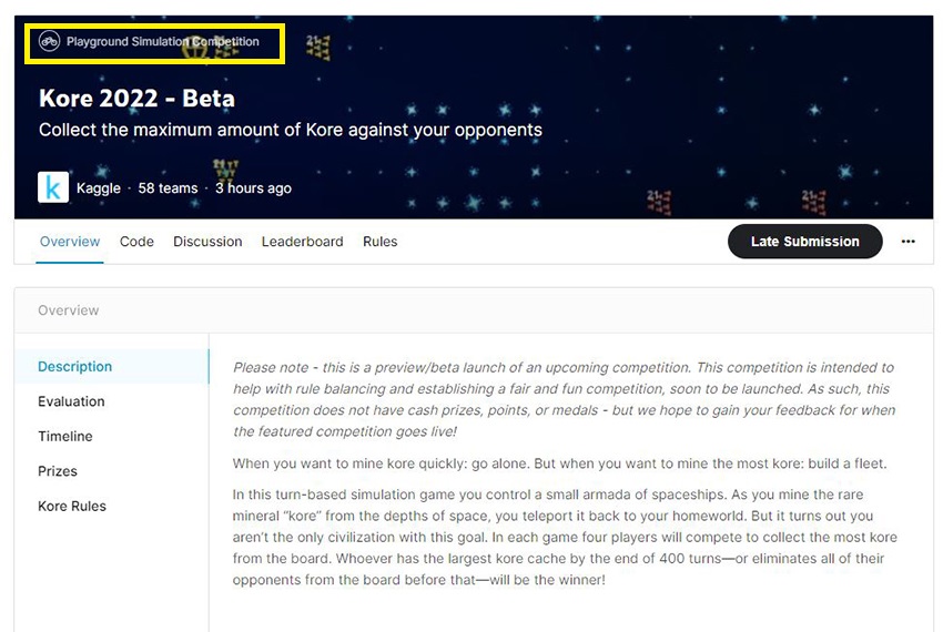 The playground competitions are more about having fun during the machine learning participation. Problems such as identifying Dogs VS Cats, Predicting Victory margin in Basketball Tournament can be seen in this list of competition. The Playground is basically just a notch over in terms of difficulty compared to the Getting Started challenges. It is for newcomers who are interested in low-stake competition to win some small cash prizes.
