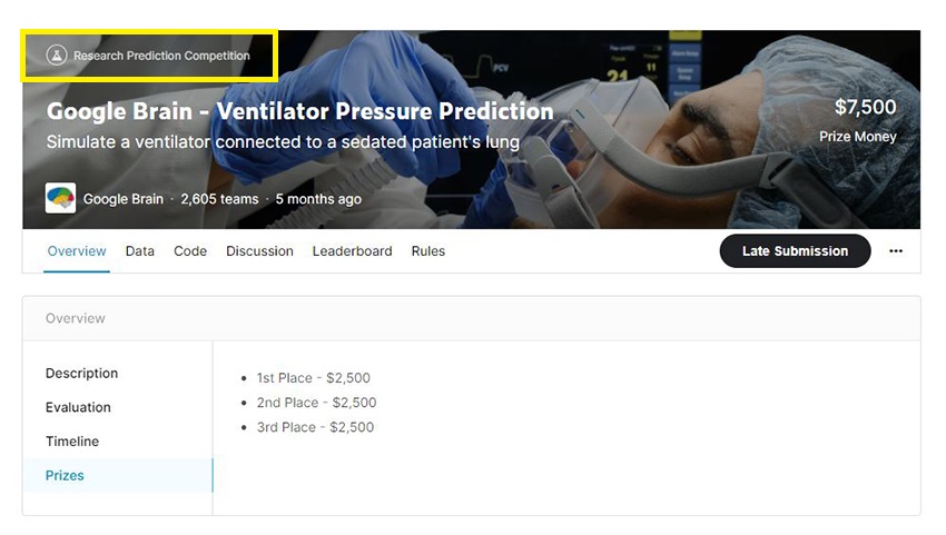 Some of the Research Competitions are TensorFlow – Help Protect the Great Barrier Reef, Google Brain – Ventilator Pressure Prediction, SETI Breakthrough Listen – E. T. Signal Search and more.