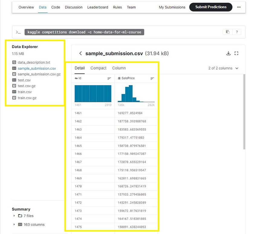 Under the Data Tab, we can see all the different files of the dataset and the structure of file formats necessary for submission. Moreover, you’ll also find the details of all the columns of the data which will be used for machine learning.