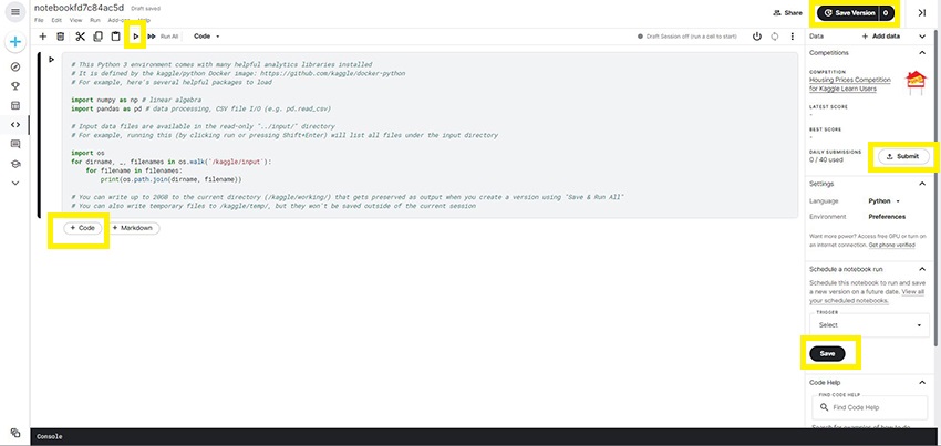 Kaggle provides you Notebook itself to code the entire machine learning process. Under Code in the Menu, Click on New Notebook and you’ll be provided with some library package calls and input and output connection.