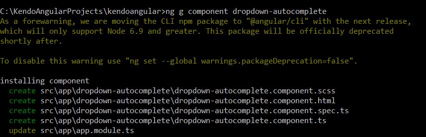 Let’s create a new component. In this article, we are going to see Kendo autocomplete for Angular 2. To use the autocomplete control, first we need to install the Kendo dropdowns module, give the command given below to install the Kendo dropdowns