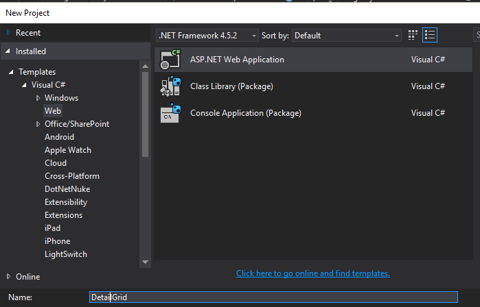 Create an empty Web API application using an installed web template in Visual Studio as in the following figures: