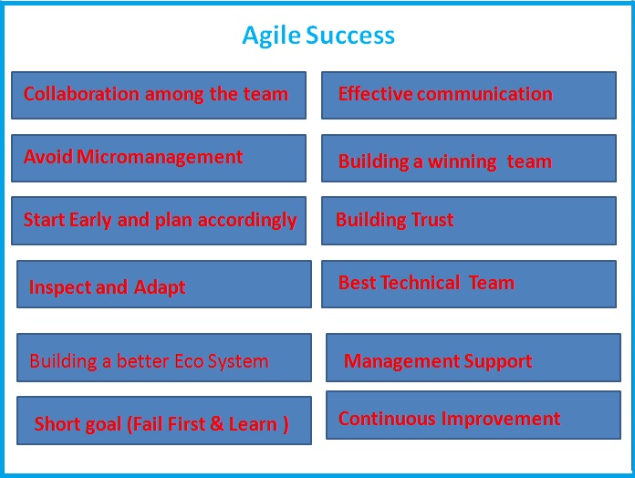 Collaboration is the key to success to the agile team. As agile has a short iteration development time frame the team collaboration is the key to success.