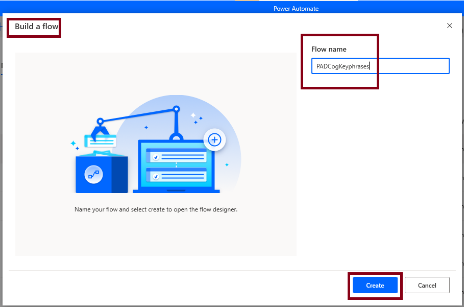 Next, Give the Flow name as PADCogKeyPhrases, Click the Create button,