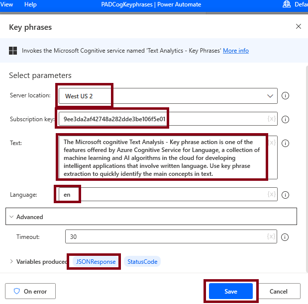 Next, Add the Key phrase action, Set the Server location Parameter as West US 2, Subscription key Parameter as ************** and Text Parameter as InputTextLanuage variable, Variable Produced Parameter as %JSONResponse% and Click Save Button