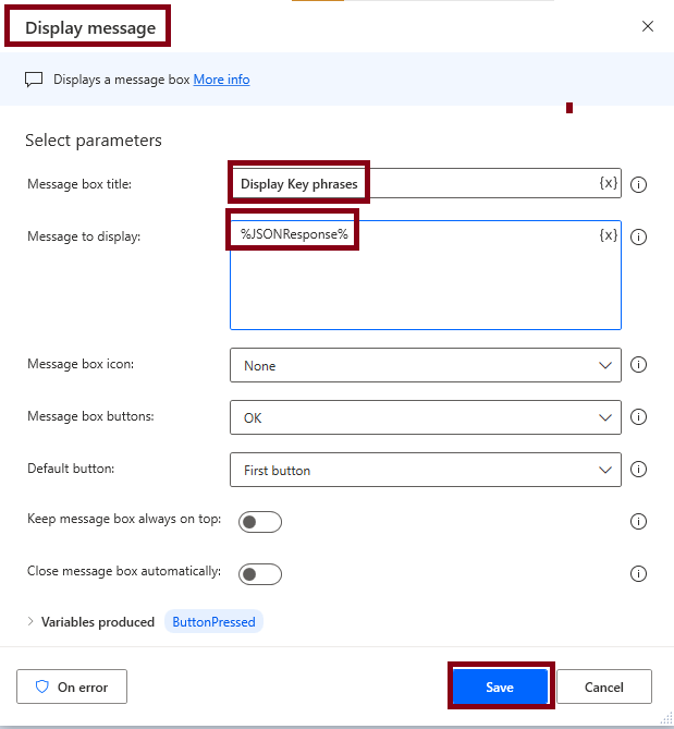 For Displaying Result, Add the Display message action and Set the Message box Title Parameter as Display Key phrase, Message to display Parameter as %JSONResponse% Click Save Button