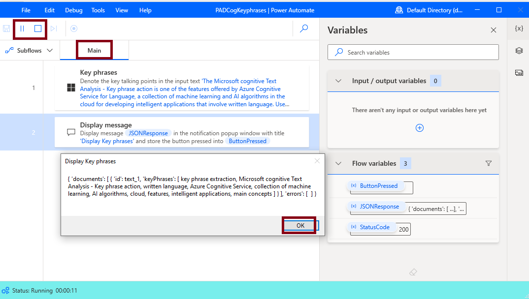 Now you have successfully tested Microsoft cognitive Text Analysis - Key phrase action in Desktop flow - PADCogKeyPhrases in Microsoft Power Automate.