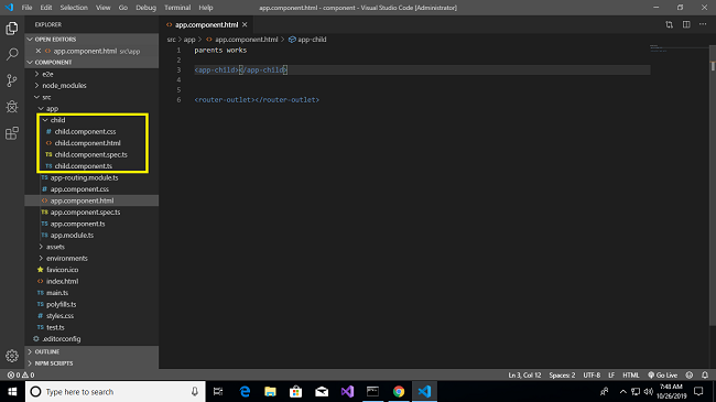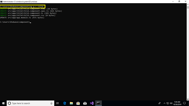 So as you can see we have created a new Angular project and now we are going to create a new child component. So, same as creating a component by using the following syntax and in which we will use the inside of parent component.