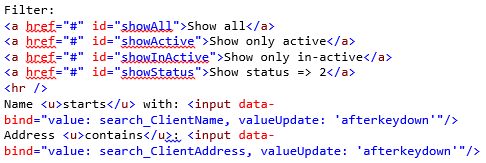 The last thing to do to check if it works is to put an html control in pace and bind this to the new observable search string member (self.search_ClientAddress).