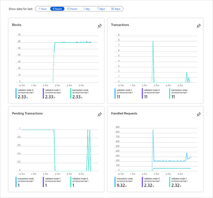 Through Azure Monitoring service, it provides insights into nodes, CPU, memory, and storage usage information. Besides this, Azure Monitor provides insight to Blockchain network activities for a instance, transactions, block mined, transaction queue depth and active connections. Additionally, notification and alter can be send to the user regarding monitoring and logging information through an email or text message by running a Logic App and Azure function.