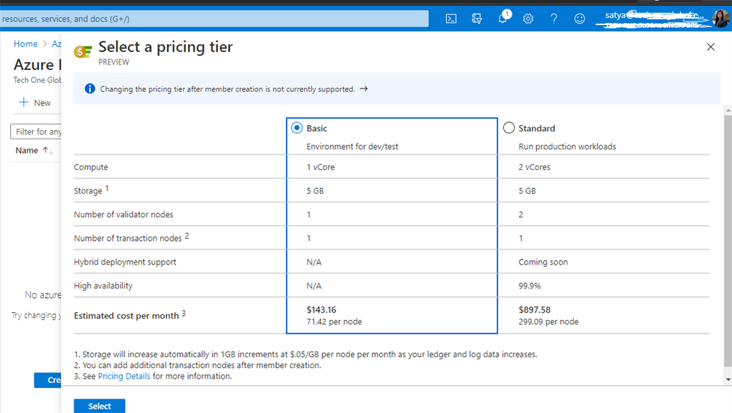 We can use the Basic tier for development, testing, demonstration, and proof of concepts where Standard is preferred for production deployment. We can see the differences of compute, storage, no of validation nodes, transaction nodes, Hybrid deployment support and High availability and estimated cost for Basic and Standard tier in below image.