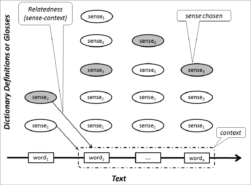 This is the definition from Wikipedia: "It is based on the hypothesis that words used together in text are related to each other and that the relation can be observed in the definitions of the words and their senses. Two (or more) words are disambiguated by finding the pair of dictionary senses with the greatest word overlap in their dictionary definitions. It searches for the shortest path between two words: the second word is iteratively searched among the definitions of every semantic variant of the first word, then among the definitions of every semantic variant of each word in the previous definitions and so on.Finally, the first word is disambiguated by selecting the semantic variant which minimizes the distance from the first to the second word."