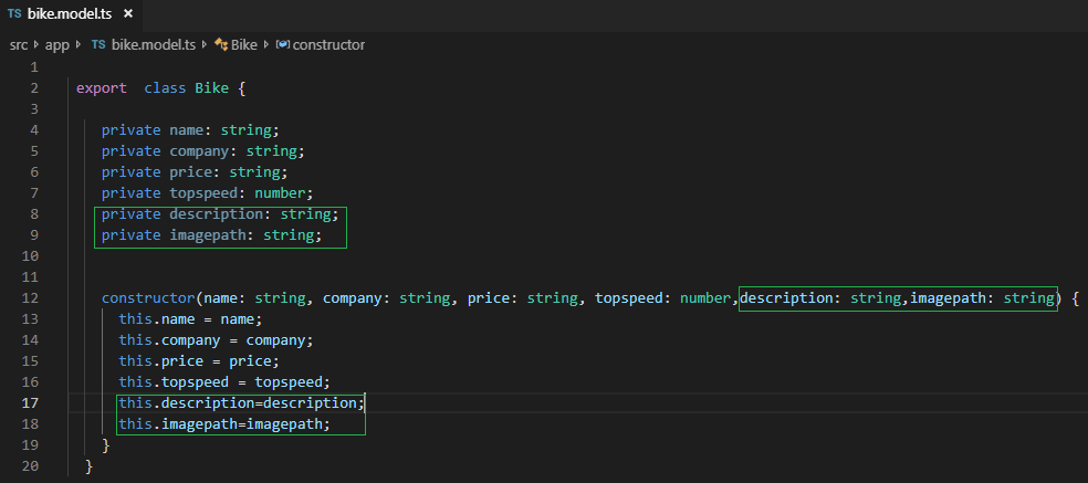 First, add 2 more properties in the bike model class and update the constructor accordingly.