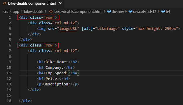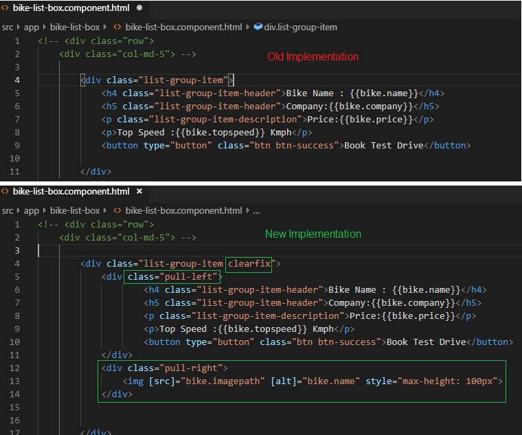 Here, I have used 2 inner div elements. For one, I used pull-left class and pull-right for the others. Then, we moved old contents into the first div and the image element is added inside the second div. Here, the statement [src]=”bike.imagepath” is called property binding in angular. We can use the interpolation method to do the same. Then the statement will be like below src="{{bike.imagepath}}" To learn more about property binding and string interpolation, visit