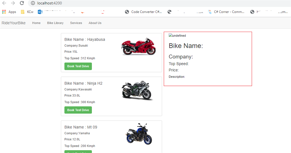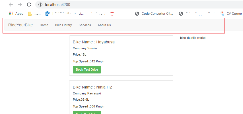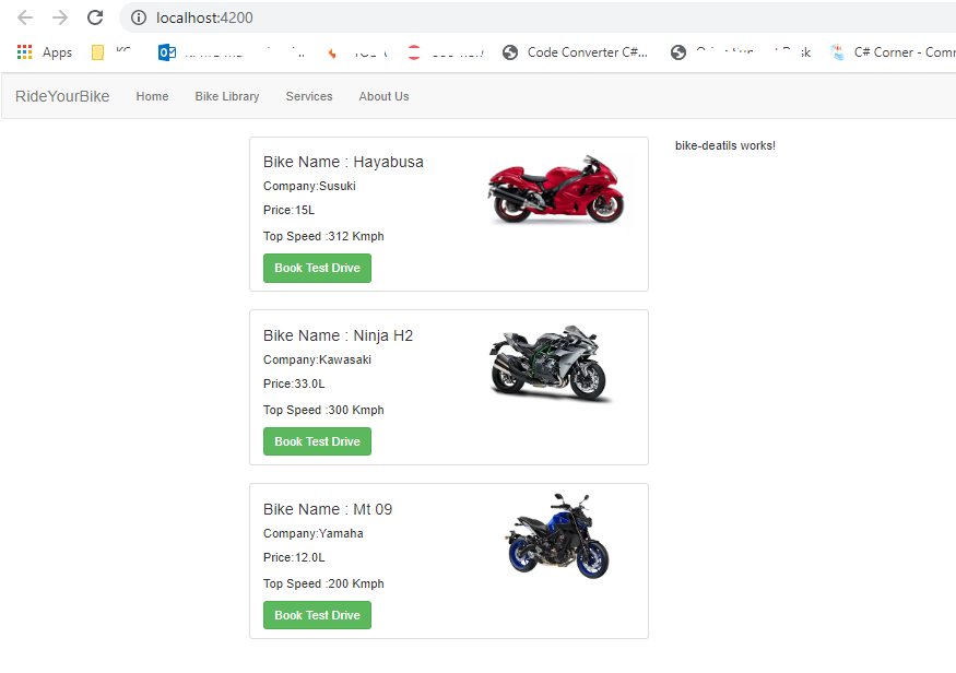 Open the bike-details.component.html file and add some HTML statements to display the bike details such as bike image in a bigger size, name, company name, description, etc.