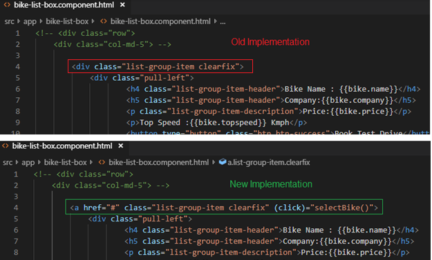 To implement this, we have to update the bike-list-box.component.html of the bike-list-box component.