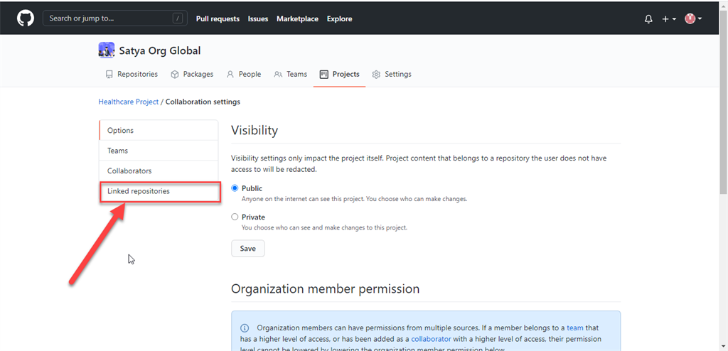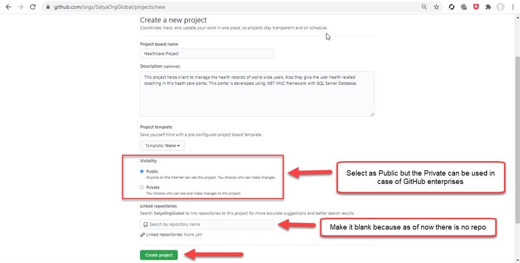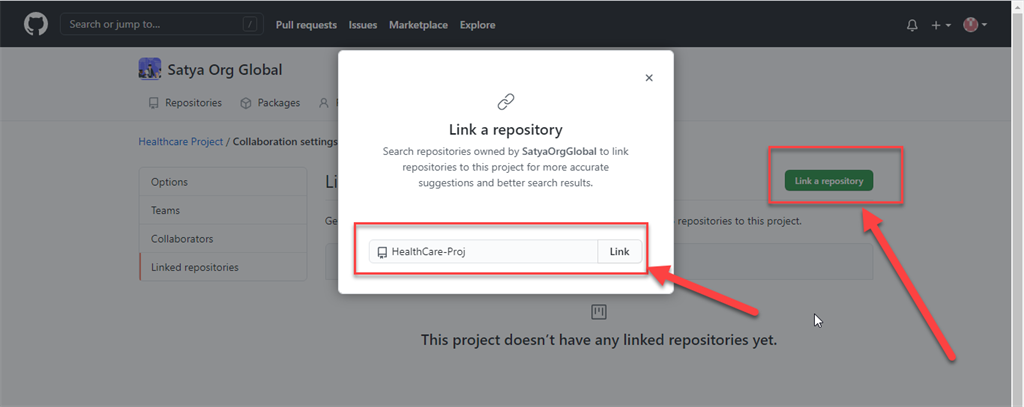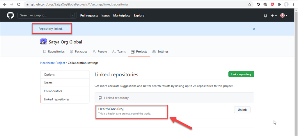 Now our GitHub organization is ready with a project with a linked repository as shown earlier.