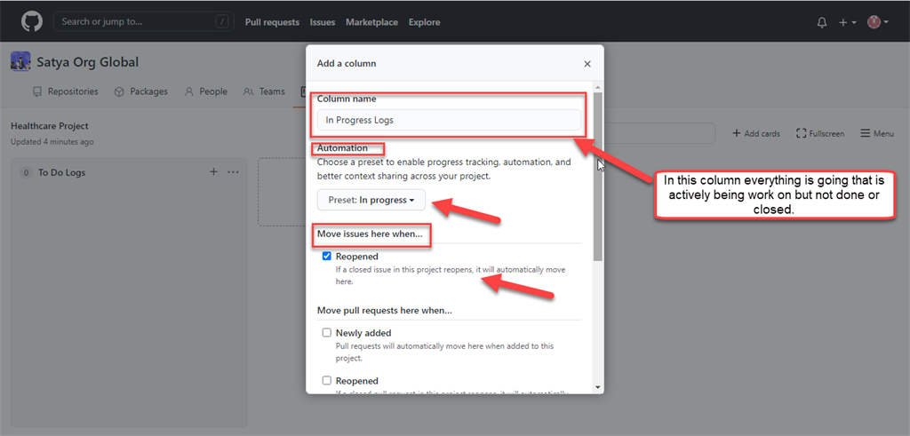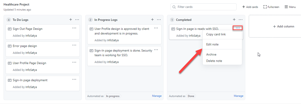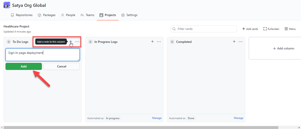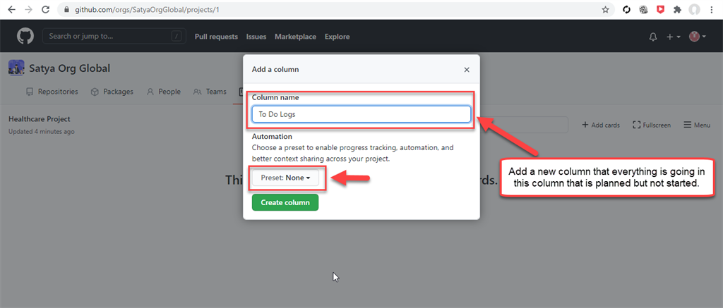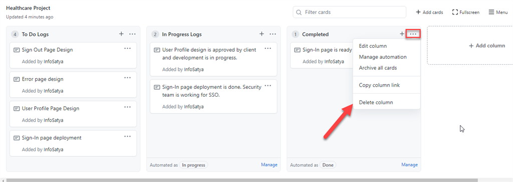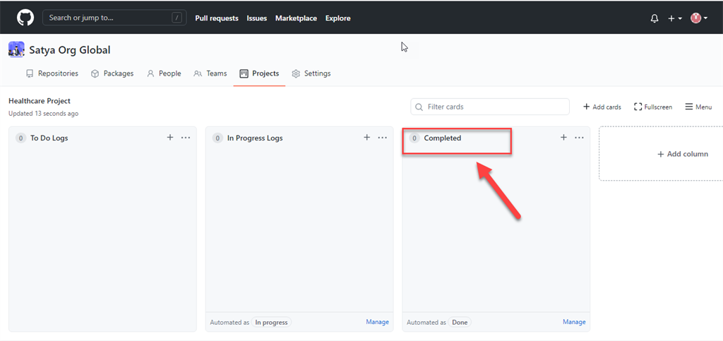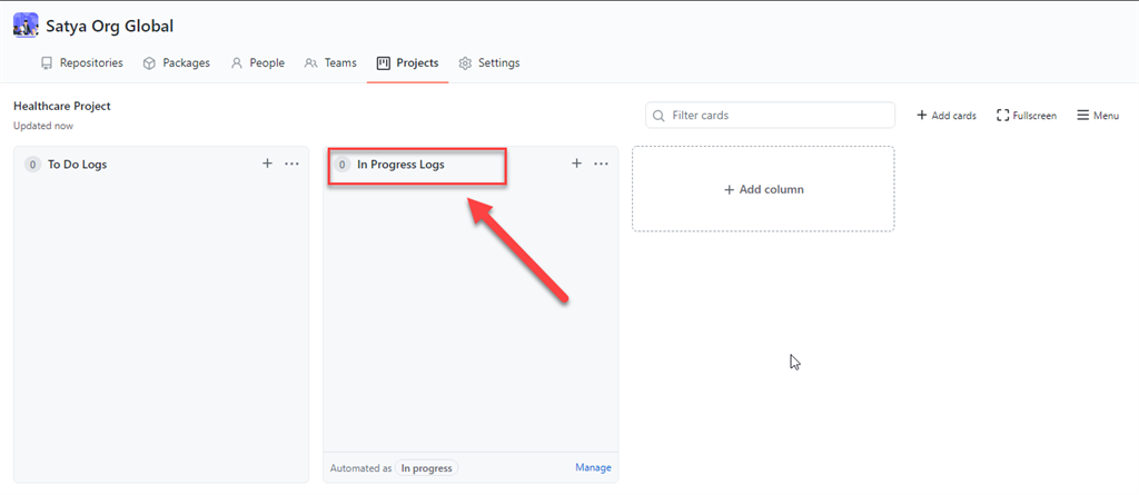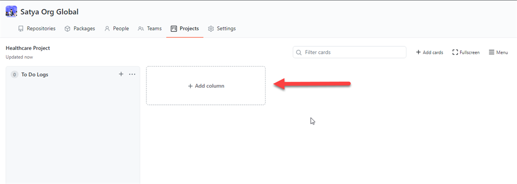 After successful creation of the Project Board, the interface will be as shown below and next click on Add column,