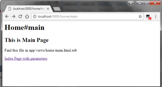 Above the output we can see the normal HTML link tag in the index page, if you like moving to the main.html.erb page, simply click that HTML link and it will go in the main page in browser. The result looks like below.