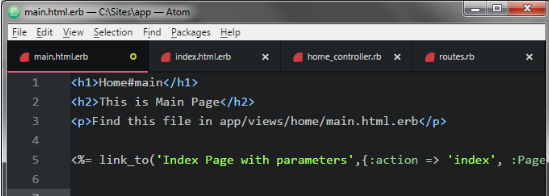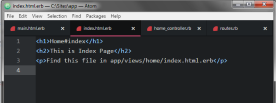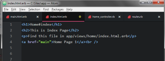 Now we use normal HTML Link method in application.open index.html.erb file in app>>views>>home folder use in atom editor.
